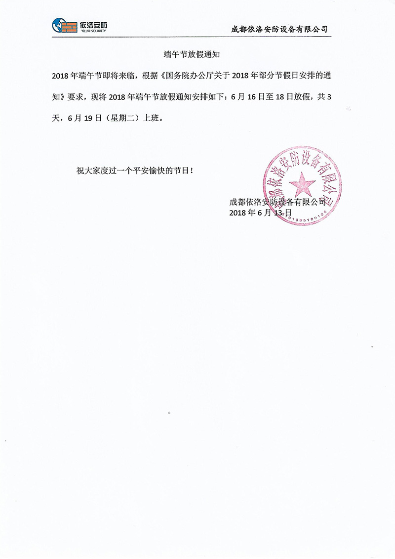 成都依洛安防設(shè)備有限公司端午放假通知